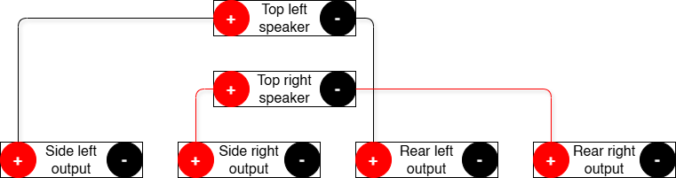 - Connect the Top side left speaker's + terminal to the Side left output's + and the speaker's - terminal to the Rear left output's +.